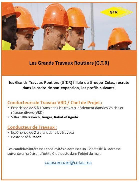 -Conducteurs de Travaux VRD (Chefs de Projets): Expérience de 5 à 10 ans dans les travaux idéalement dans les Voiries et réseaux divers (VRD). Villes: Marrakech, Tanger, Rabat et Agadir